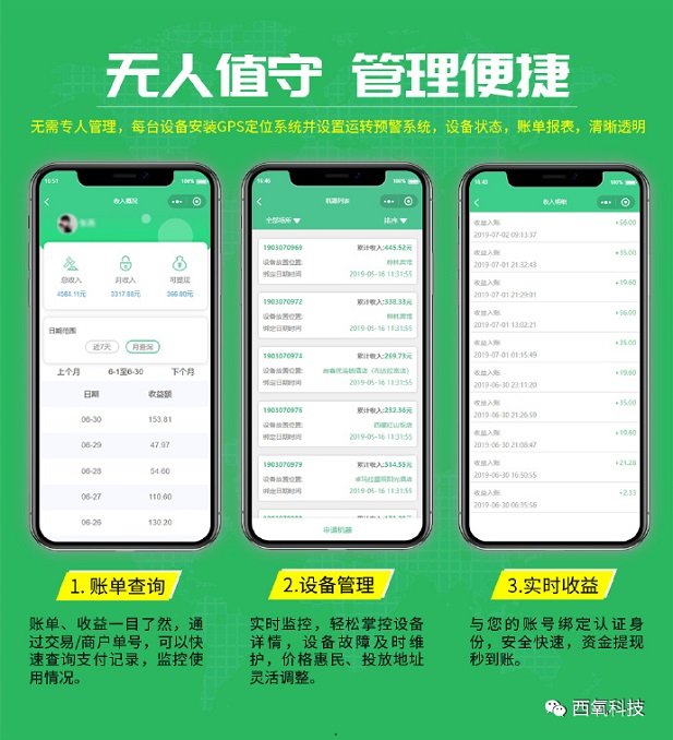 用户通过关注“西氧科技”公众号,或则通过小程序搜索'西氧商户助手'可以进入商户助手小程序注册登录,并随时随地管理自己的机器!